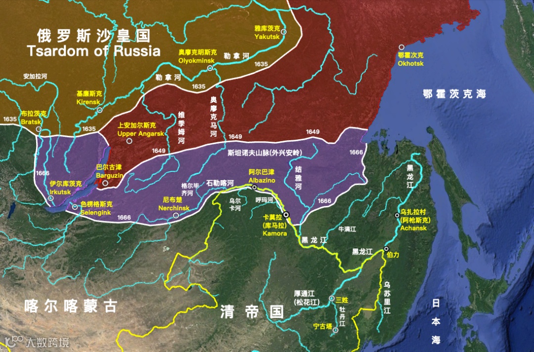 17世纪40年代开始,俄国人开始进入贝加尔湖流域,先后在贝加尔湖周围建立了上安加尔斯克(Upper Angarsk, 1646年),巴尔古津堡(Barguzin, 1648年),伊尔库茨克(Irkutsk, 1652年),色楞格斯克(Slenginsk, 1663年),1666年又在今乌兰乌德一带修建了冬居地,基本控制了贝尔加湖一带。