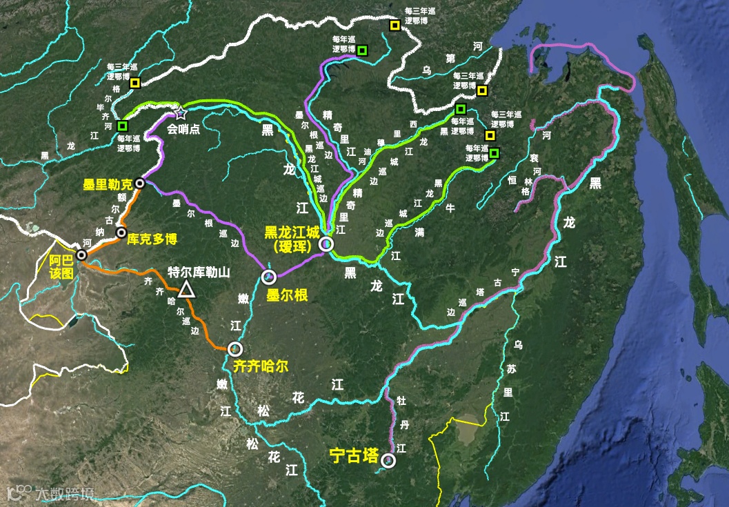 齐齐哈尔巡边:从齐齐哈尔西行,过特尔库勒山,至额尔古纳河上游,再沿额尔古纳河而下,过库克多博至墨里勒克与墨尔根巡边队伍会哨。
