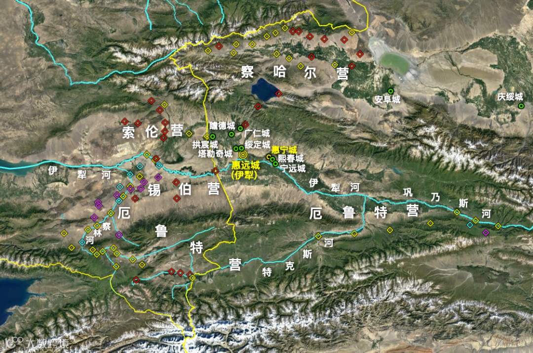 (黄色圆点为满营驻防城,绿色圆点为绿营(汉营)驻防城,菱形点为各营驻守卡伦分布)