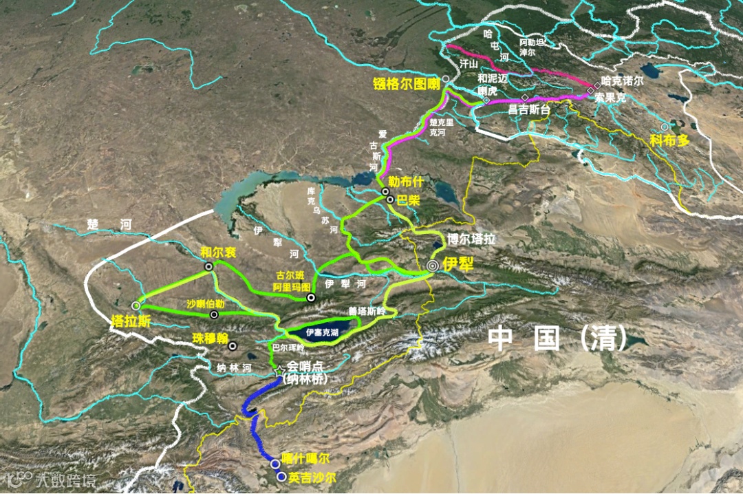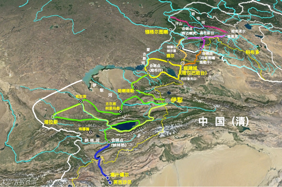 (参考李之勤《18世纪中叶至19世纪中叶清代西北边疆的巡边制度和巡边路线》和宝音朝克图《清代北部边疆卡伦研究》,图中深红线为科布多所属阿勒坦淖尔巡边路线,洋红线为科布多西巡路线,4条绿线为伊犁的北上巡边以及西南巡边路线,蓝线为喀什噶尔巡边路线)
