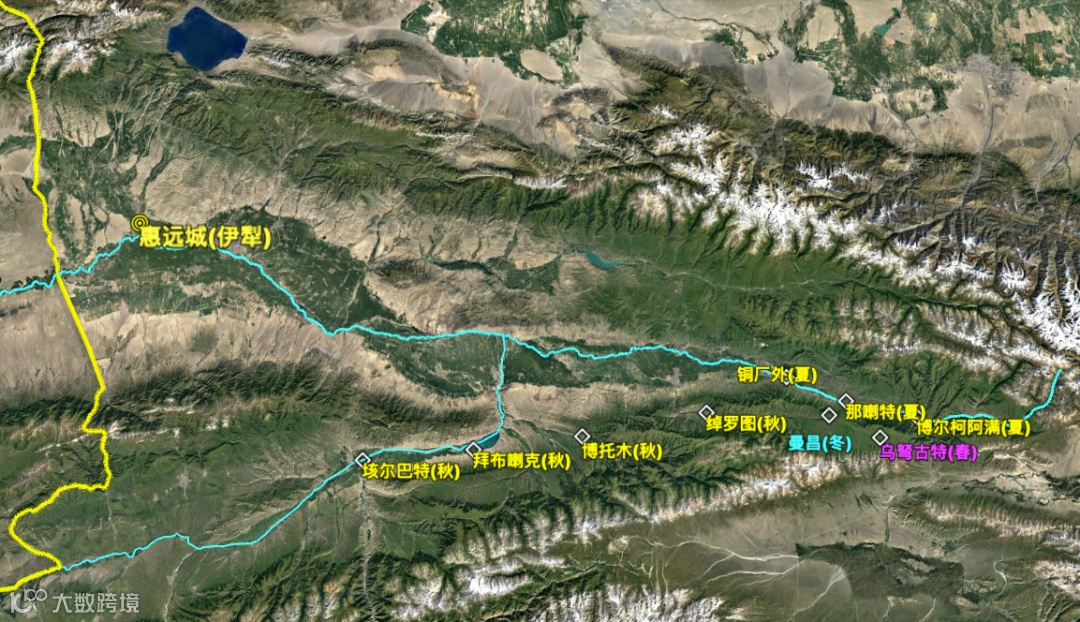 伊犁的北上路线:分为两条:1.伊犁->阿勒坦额默勒山(今阿尔滕埃麦利山)->库克乌苏河(卡拉塔尔河)上游->勒布什->爱古斯河->楚克里克河(今科克佩克特河)->布昆河(今布康河)->辉迈拉虎;2. 伊犁->博罗塔拉(今博尔塔拉)->库克托木岭->巴柴(比西罕)->勒布什。