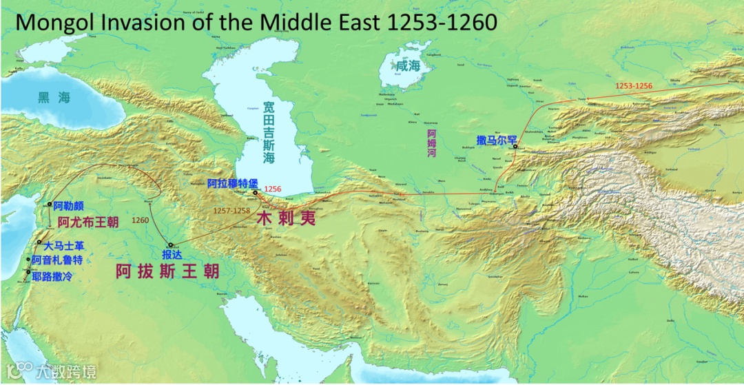 1248年,贵由汗去世,1251年托雷(Tolui, 成吉思汗的第四子)的长子蒙哥(Mongke)继承汗位。1253年,蒙哥汗以木剌夷(以伊朗里海南部阿拉穆特堡Alamut Castle为中心的伊斯兰阿萨辛派Assassins)不肯对蒙古称臣朝贡,派遣弟弟旭烈兀(Hulagu)率大军西征中东地区,自己则随后集中兵力征服南宋。
