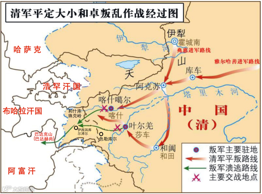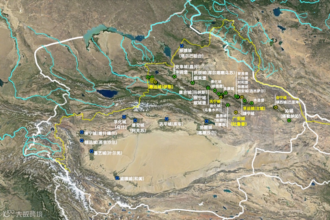 (清军主要驻防于天山北麓至伊犁河谷一带,塔尔巴哈台和南疆则采取换防制度,图中黄色圆点为满营驻防城,绿色圆点为绿营(汉营)驻防城,蓝色方点为换防城)