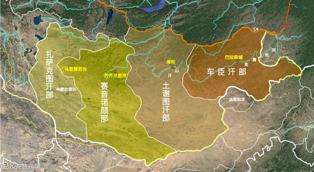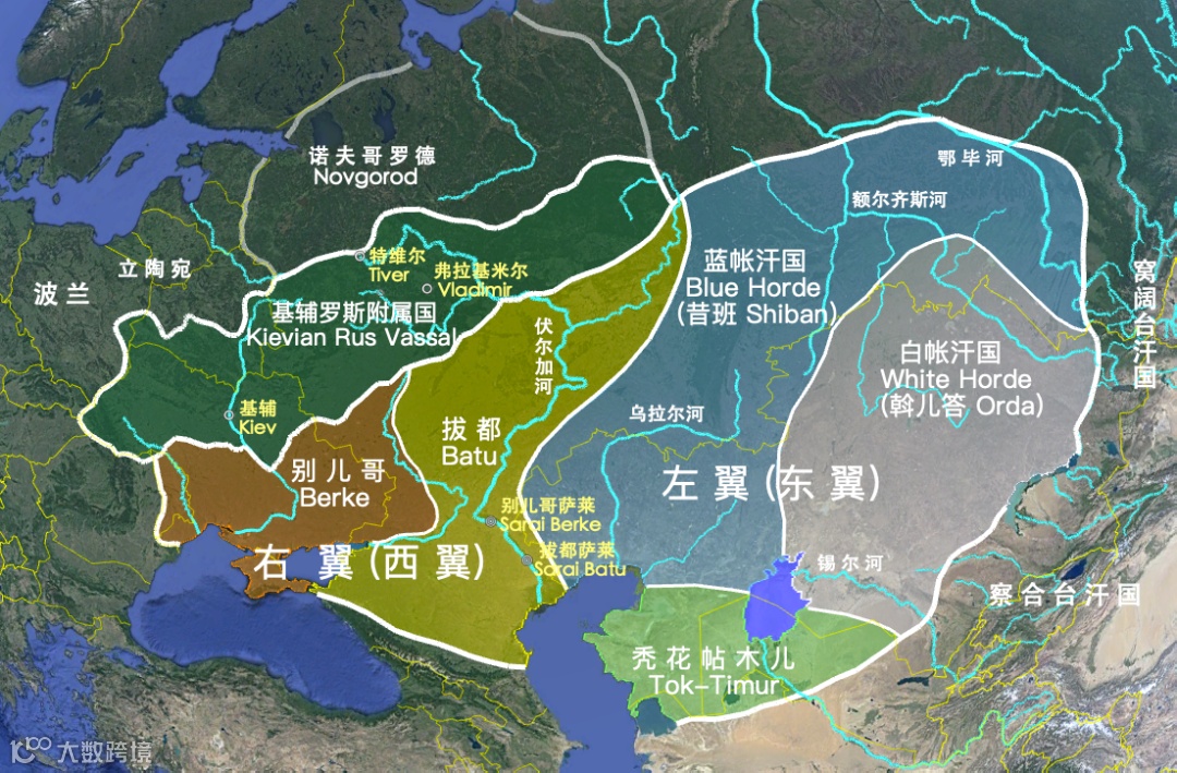 历史上对白帐汗国(White Horde)和蓝帐汗国(Blue Horde)的划分存在多种说法,这里,采用哈萨克人的说法,白帐汗国指代金帐汗国的东部斡儿答(Orda)的领地,蓝帐汗国则指代昔班(Shiban)的领地。