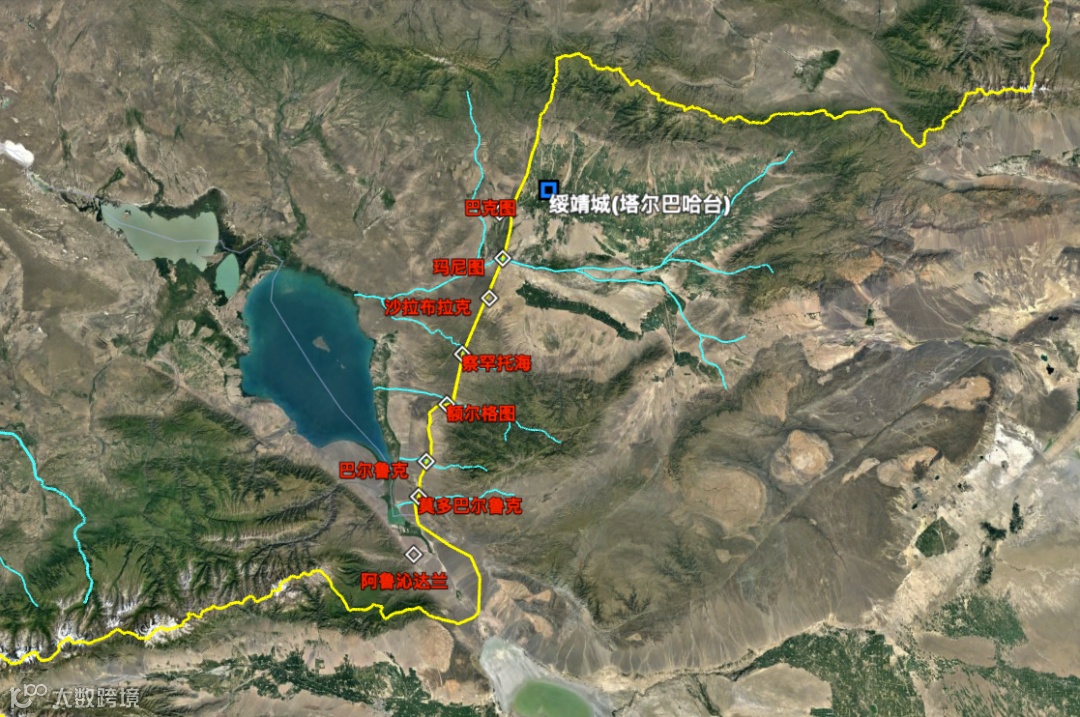 塔尔巴哈台的西南巡边路线:绥靖城->雅尔(今乌尔扎尔)->昭莫多->勒布什(在此与伊犁北上巡边部队会哨)->巴柴(比西罕)->沿阿拉克图古勒淖尔(今阿拉湖)南岸(在此收取哈萨克贡赋)->巴尔鲁克->绥靖城。
