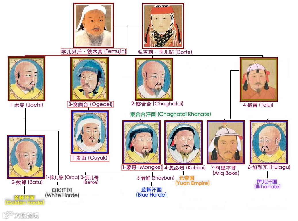 十二世纪末十三世纪初,铁木真(BorjiginTemujin, 孛儿只斤氏,读作“bó ěr jì jǐn”)征服了蒙古高原各部落,于1206年在斡难河(今鄂嫩河,Onon R.)源头建立“大蒙古国”,成为蒙古大汗,尊号“成吉思汗”(Genghis Khan)。