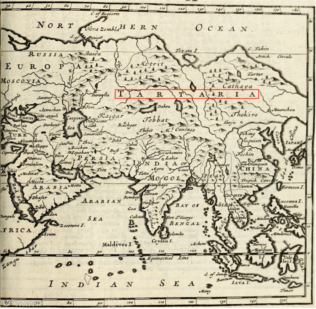 (截取自1701年版Moll Herman的“A system of geography; or, A new & accurate description of the earth in all its empires, kingdoms and states”)