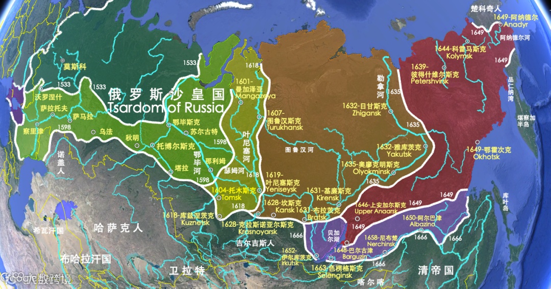 沙俄在征服西伯利亚汗国后,为加强在西伯利亚地区的统治,首先于1586年和1587, 在原来的成吉-图拉和卡什里克附近先后构筑起秋明(Tyumen)和托博尔斯克(Tobolsk)两座要塞(英文称“Ostrogs”)。在原来西伯利亚汗国的北部地区又建立别列佐夫(Beryozovo, 1593年)和曼加泽亚(Mangazeya, 1601年),东部建立苏尔古特(Surgut, 1594年), 塔拉(1594年)和那利姆(Narym, 1596年),以巩固对鄂毕河下游的涅涅茨人(Nenets)以及鄂毕河中游的奥斯蒂亚克人(Ostyak)的统治。而后,溯鄂毕河而上建立托木斯克(Tomsk, 1604年),并在1605年到达叶尼塞河,顺河而下到达瑟姆河(Sym R.)。