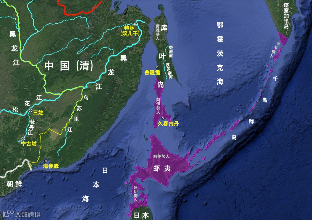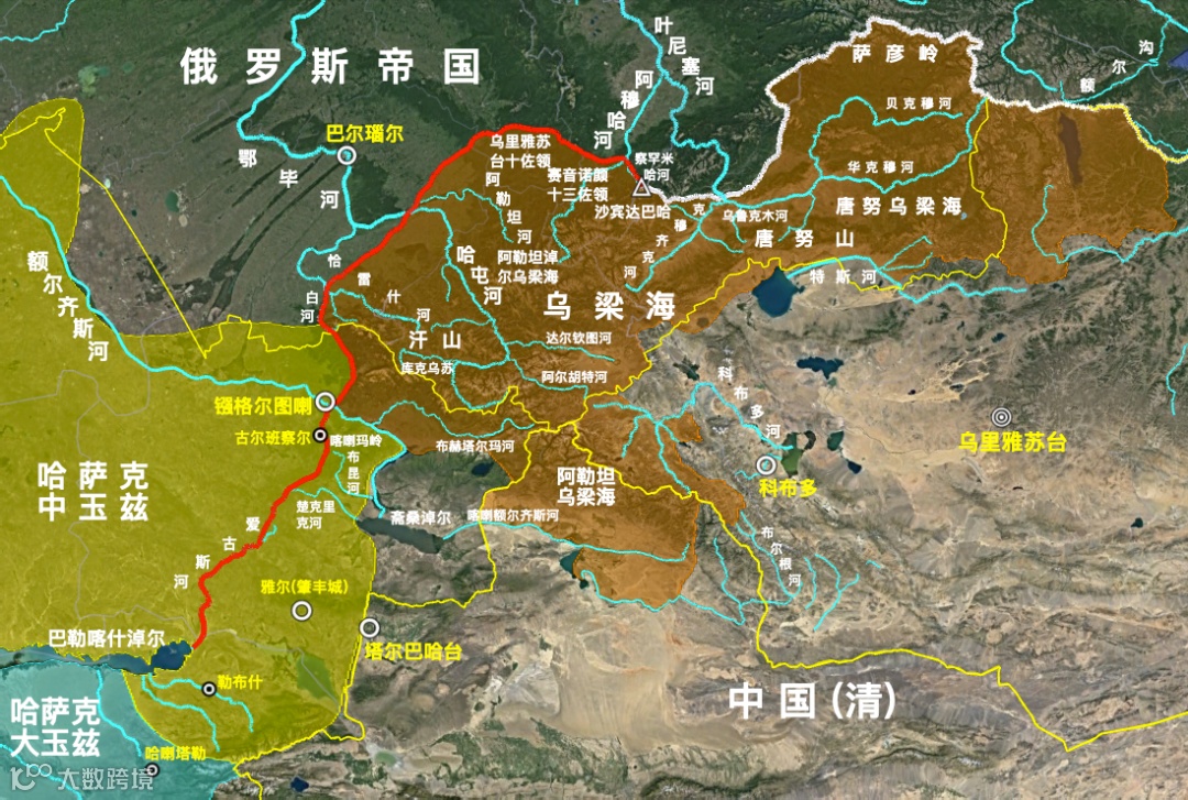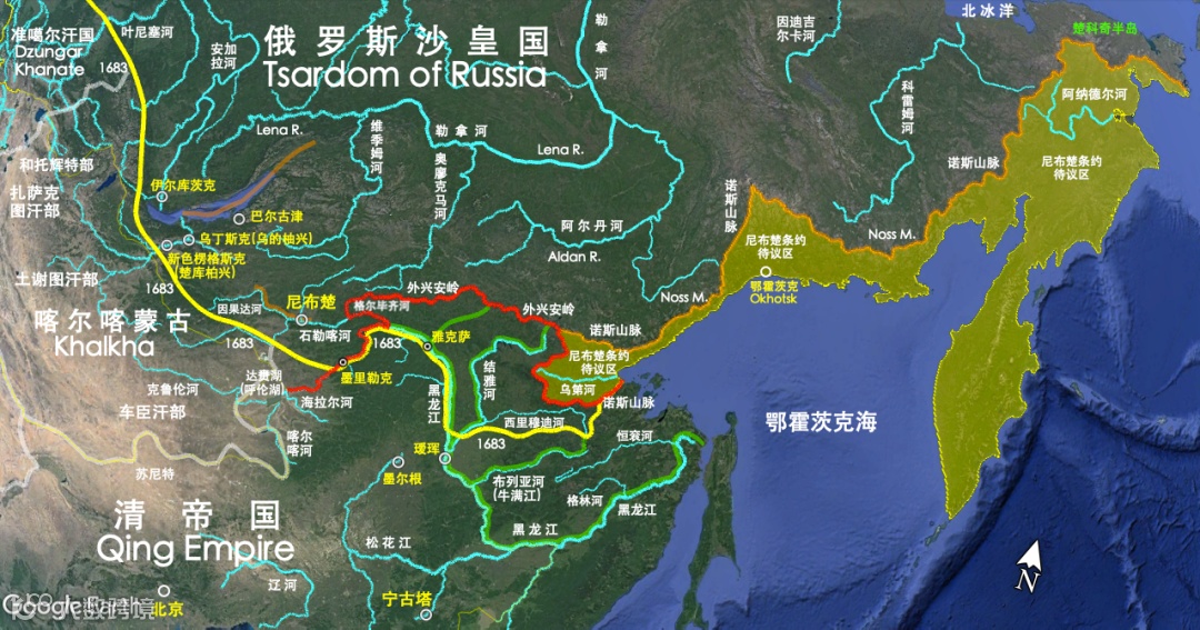 黄线为1858年《瑷珲条约》确定的中俄国界(1860年中俄《北京条约》中得到清政府正式确认)
