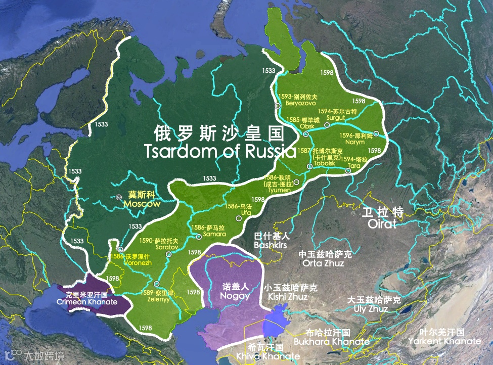 1581年,斯特罗加诺夫家族(Stroganov Family)在沙皇的支持下,招揽哥萨克领袖叶尔马克·齐莫菲叶维奇(Yermak Timofeyevich),开始向西伯利亚汗国发起进攻。1582年10月,叶尔马克突袭西伯利亚汗国,占领了额尔齐斯河边西伯利亚汗国的首都卡什里克(Qashliq, 1495年由成吉-图拉迁都至此),汗国最后一任大汗库楚汗(Kuchum Khan)逃到巴拉宾草原(Baraba Steppe, 在今俄罗斯南部鄂毕河和额尔齐斯河之间),1598年,俄国人在鄂毕河流域的塔拉城(Tara, 即今俄罗斯塔拉市)附近彻底击败了库楚汗的部队,扫清了俄国向东扩张的障碍。