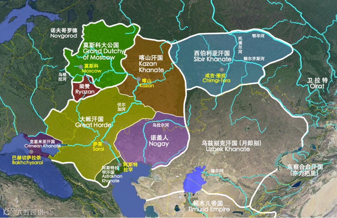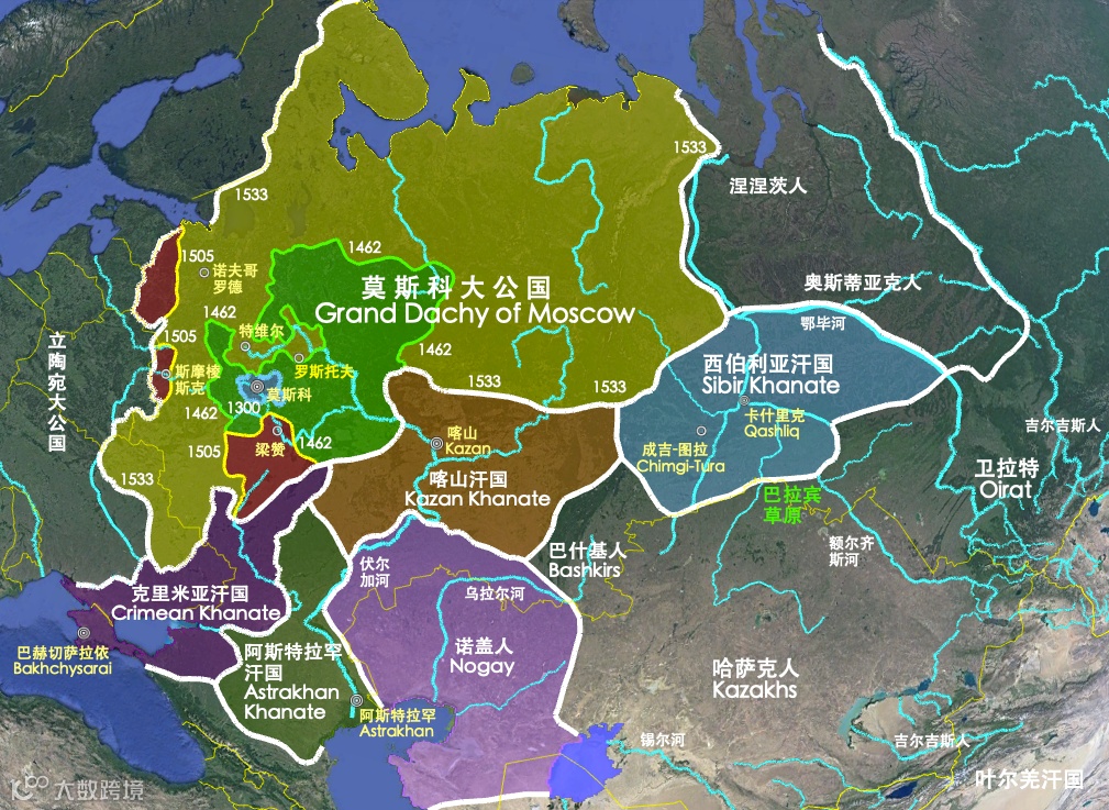 于此同时,从15世纪末开始,罗斯逐渐摆脱了蒙古鞑靼人的统治,并以莫斯科公国(Muscovy)为中心不断发展成为莫斯科大公国(Grand Dachy of Moscow)。1472年,莫斯科大公国反抗大帐汗国征税,大帐汗国阿黑麻汗(Ahmed Khan)率兵征讨,1480年在乌格拉河(Ugra R.)与莫斯科军队隔河对峙,未能渡河,征讨失败,后阿黑麻汗在1481年被伊巴克汗在西伯利亚秋明一带所杀,金帐汗国(大帐汗国)灭亡,莫斯科公国实际已获得独立。