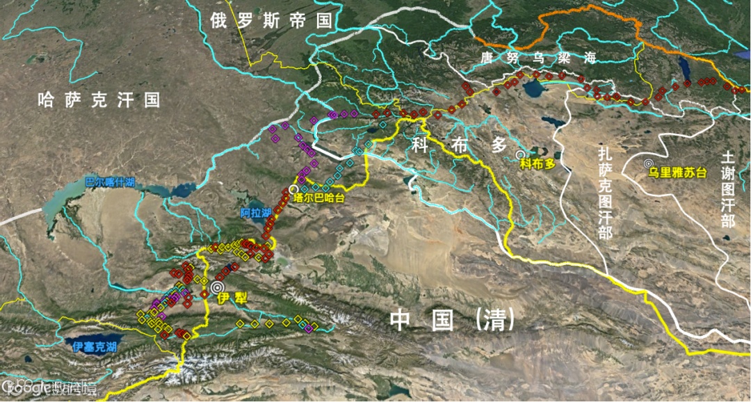 至18世纪60年代末,清朝在包括科布多,塔尔巴哈台和伊犁在内的西北边疆建立的主要卡伦分布可参考下图。