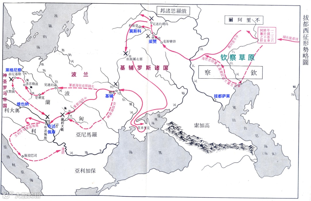此次西征灭亡了基辅罗斯,而后在莱格尼察(Liegnitz,波兰西南部城市)击溃波兰与神圣罗马帝国(Holy Roman Empire, 今天德国的前身)的联军,前锋远达奥地利维也纳近郊。1241年,窝阔台汗去世,拔都因汗位继承问题撤军东归,而后窝阔台的大儿子贵由(Güyük)继承汗位,拔都在伏尔加河下游一带建立汗国,史称钦察汗国(Golden Horde, 俄罗斯文献称“金帐汗国”)。