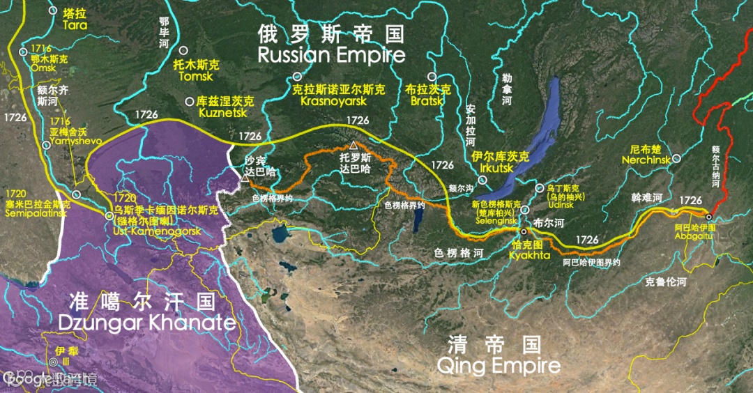 橙线为1727年《布连斯奇界约》确定的中俄国界