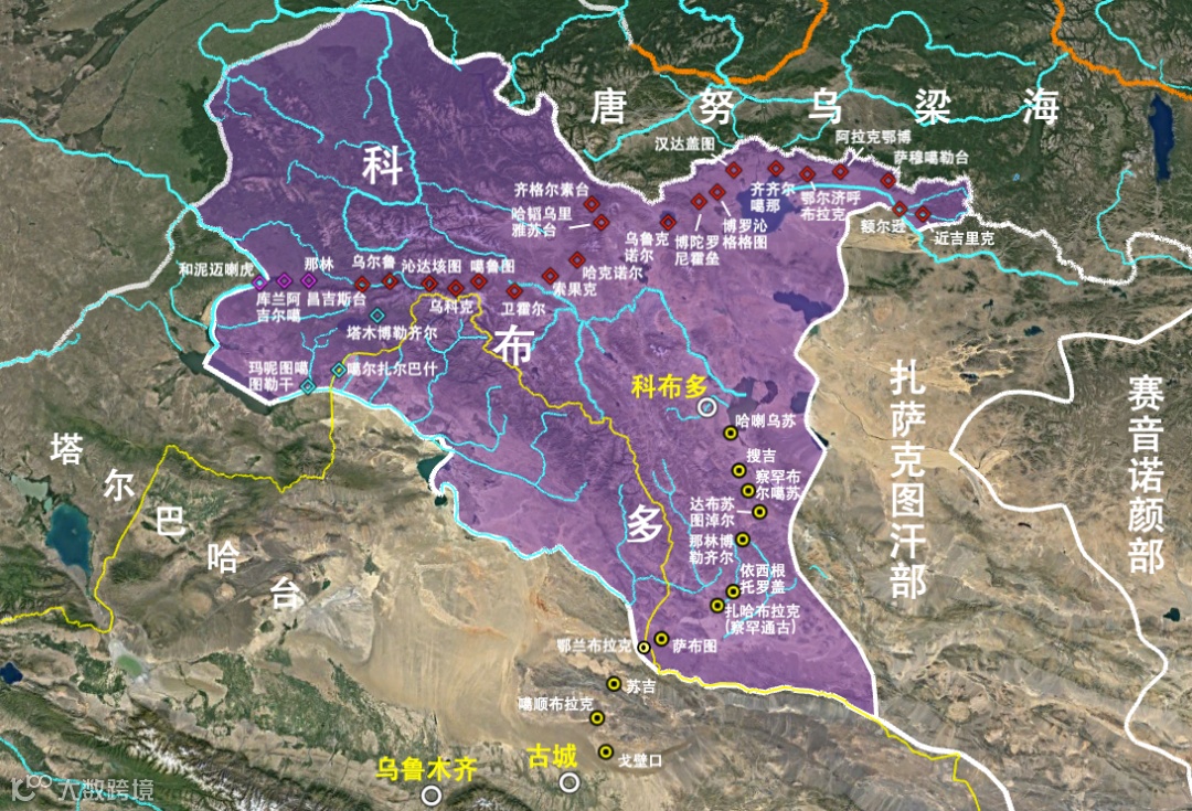 科布多的西进路线:从索果克卡伦,沿卡伦线一路向西,经过昌吉斯台,和泥迈拉虎,越过额尔齐斯河到对岸辉迈拉虎,再沿布昆河,爱古斯河到巴尔喀什湖。