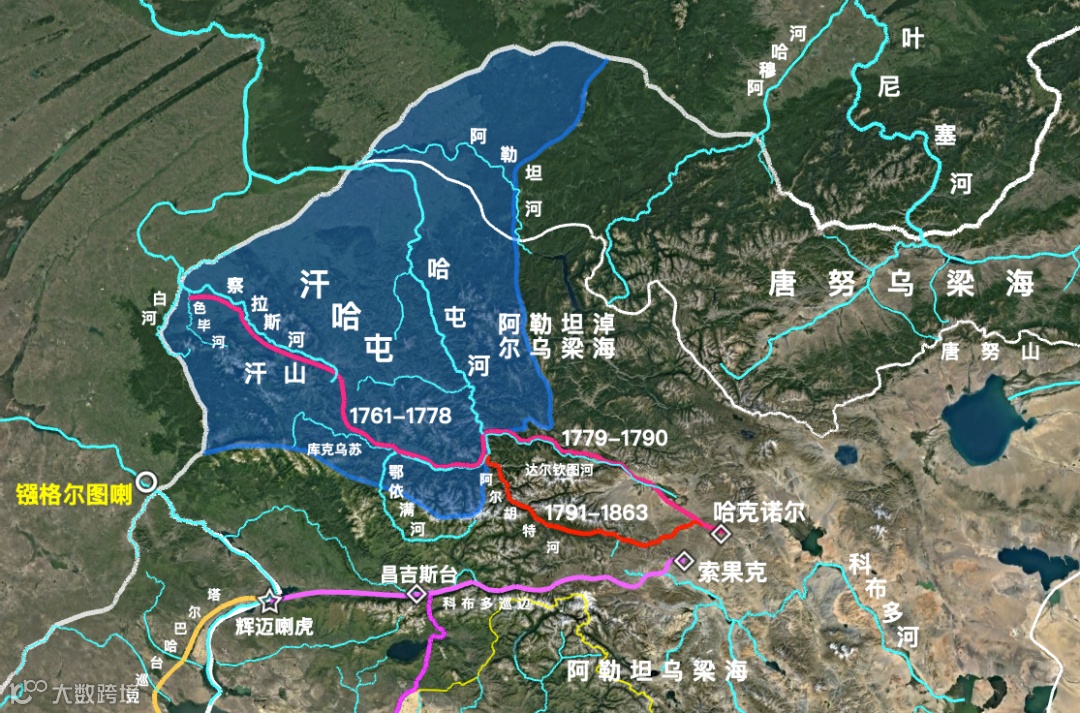 (参考谈汀《乾隆朝俄属乌梁海越界问题研究》和谭其骧《中国历史地图集》,图中橙线为塔尔巴哈台巡边路线,粉红线为科布多巡边路线,深红线为科布多所属阿勒坦淖尔1791年以前的巡边路线,1779-1790年间实际只巡边至哈屯河渡河处,红线为科布多所属阿勒坦淖尔1791年以后的巡边路线,蓝色区域为1791年清朝失去实际控制的汗哈屯地区)