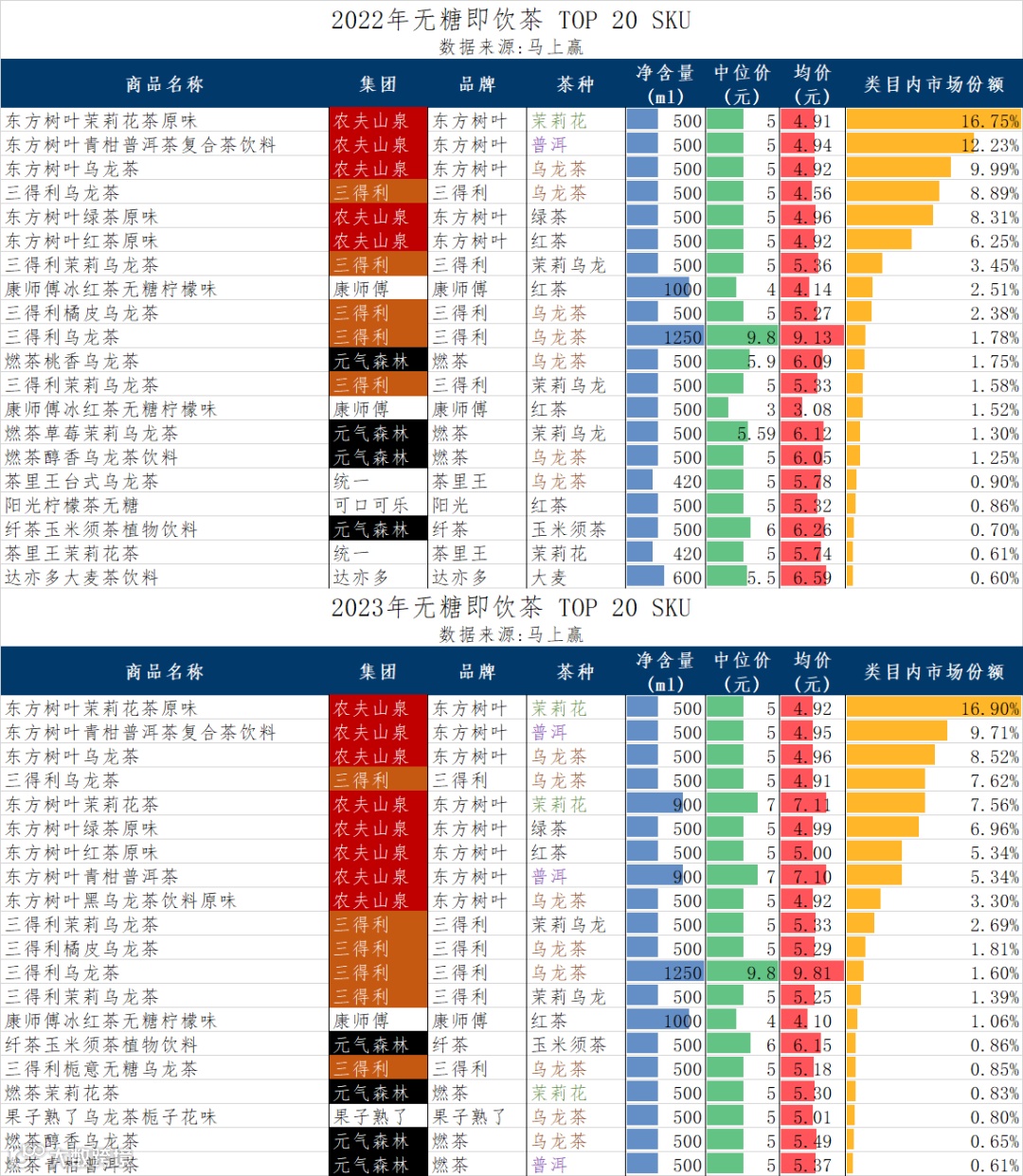 2022-2023年无糖茶Top20 SKU的市场数据跟踪 图片内容来源:澎湃号@马上赢情报站