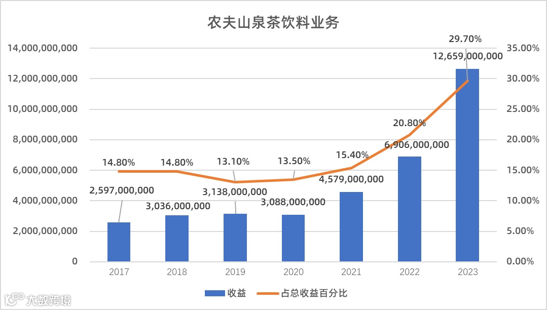 中国即饮茶市场规模从2017年的715亿元增至2021年的1015亿元,呈现持续增长态势[23]。农夫山泉茶饮业务自2019年起收益稳步上升,2023年占公司总营收29.7%[2]。