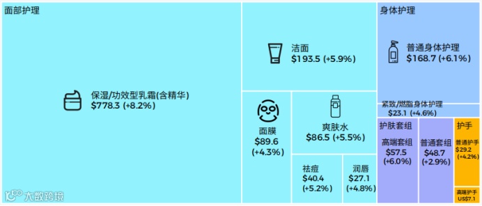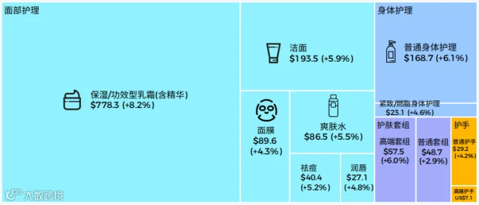 个人护理是较大的细分市场,2023年规模将达2533亿美元。其中,保湿/功效型乳霜、洁面是市场占比相对较大的护肤品类。