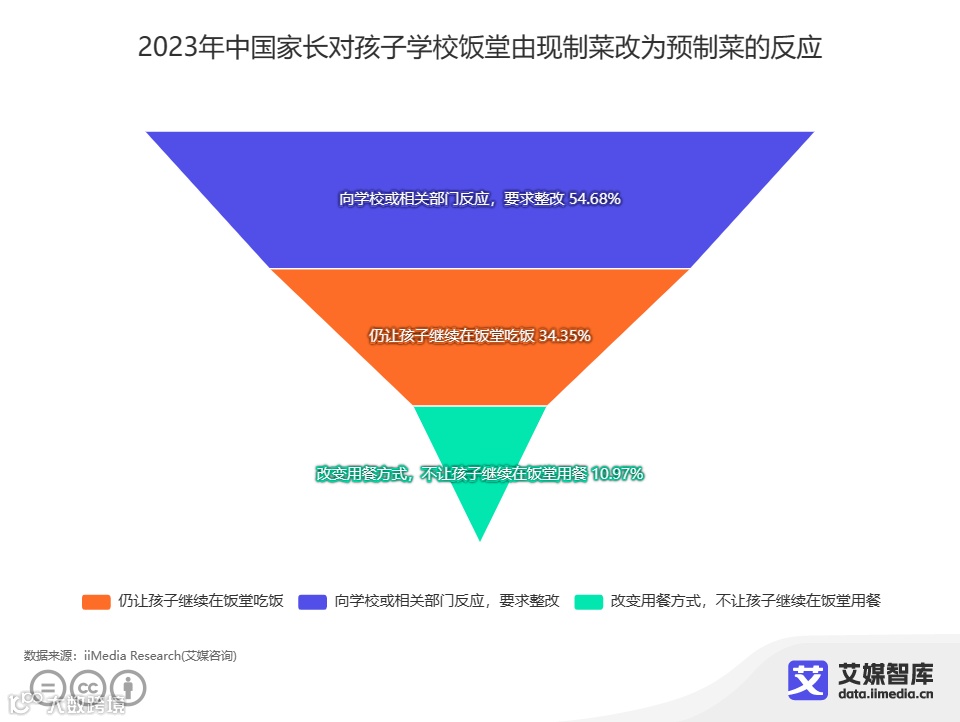 针对“预制菜进校园”,53.58%消费者表示同意,26.17%持中立态度,20.25%明确反对[k]。而家长群体反应更为强烈:54.68%表示将向学校或相关部门反映并要求整改[k]。