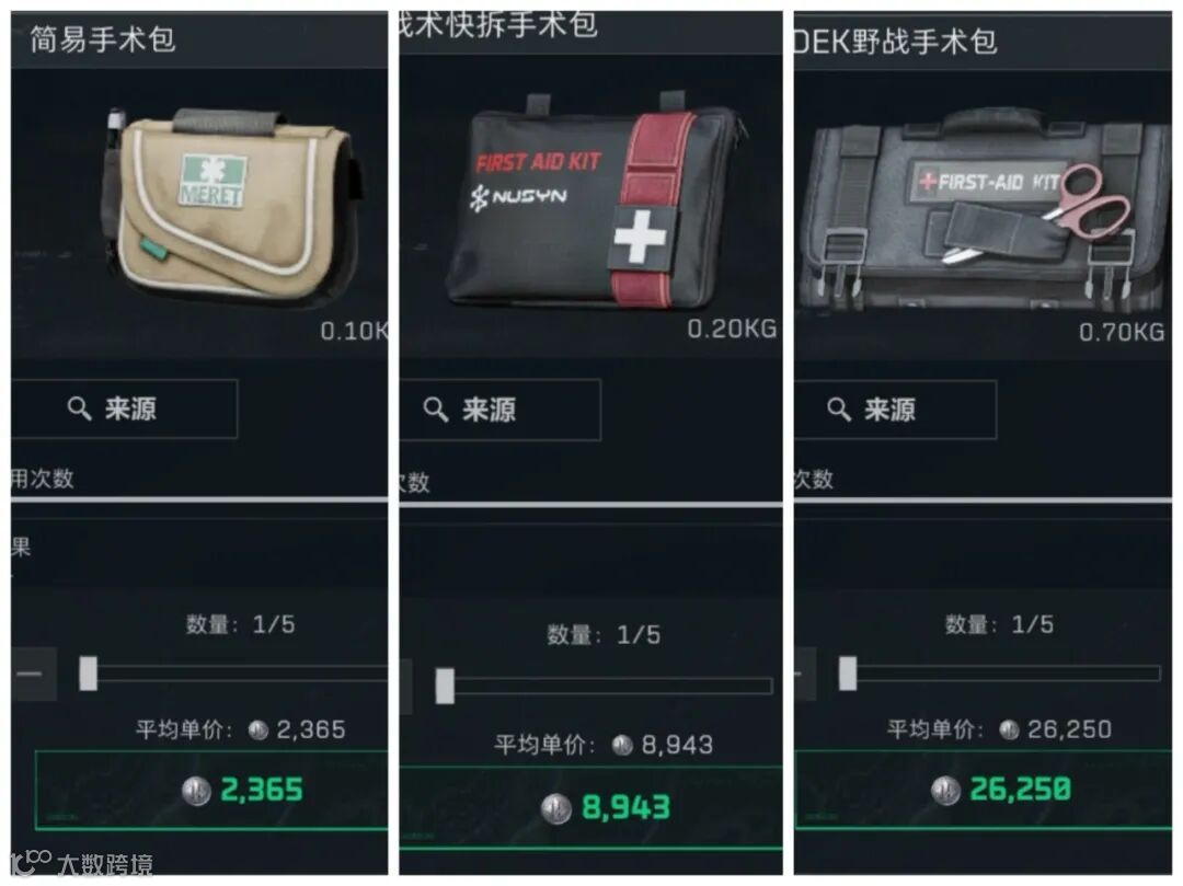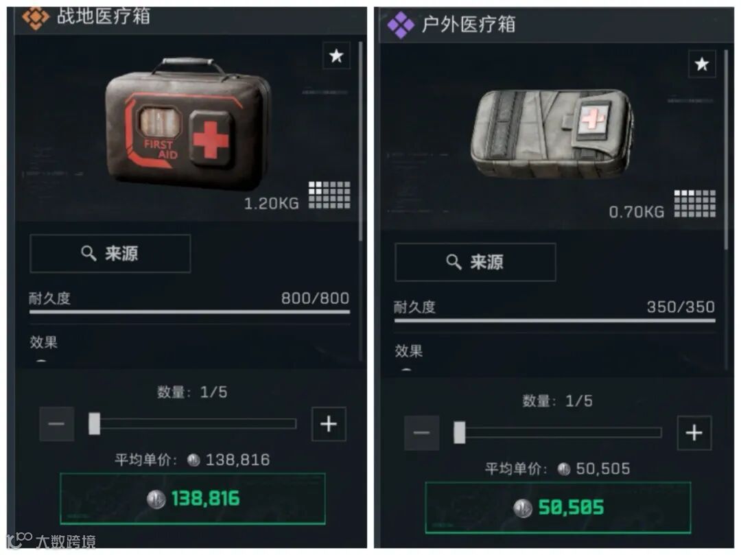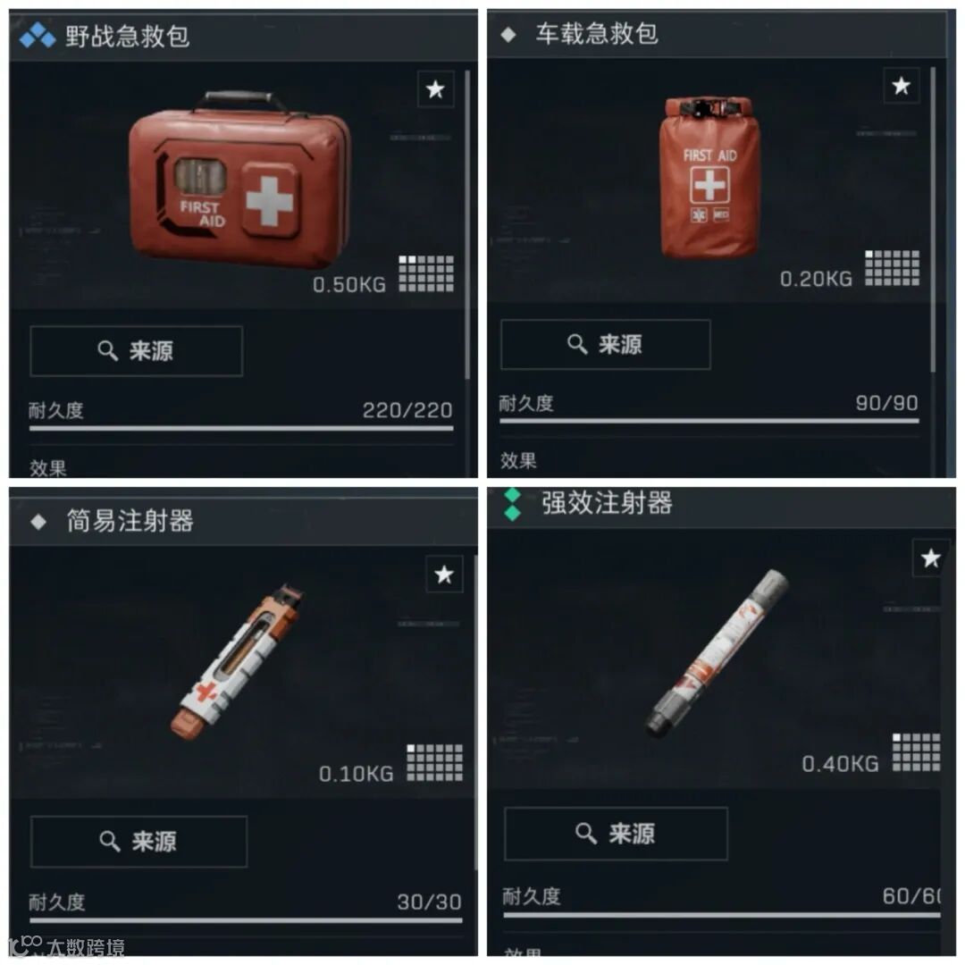 战地医疗箱;800点耐久,启用时间3.5秒,每秒可恢复30点生命值,能消耗25点耐久治疗一处伤口,还能消耗25点耐久获得60秒止痛效果。(价格太贵了,但是效果好,能在 56 秒内将濒死角色治疗至满状态。看情况携带)。