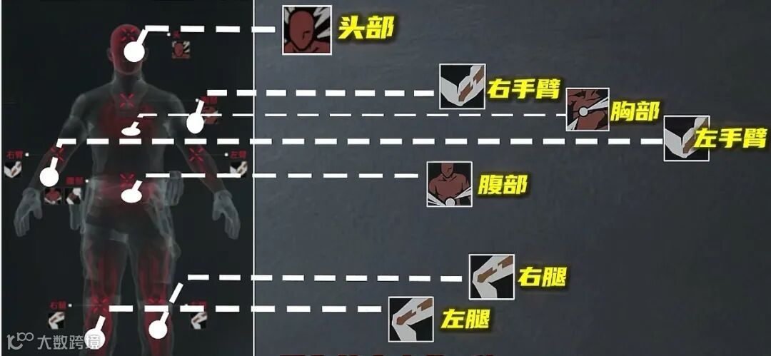 在三角洲中身体分为七个部位,分别是;头部,左手臂,右手臂,胸部,腹部,右腿,左腿,受伤状态分为;疼痛,骨折,流血,虚弱。(本篇所有内容均为游戏内内容,与现实无关)