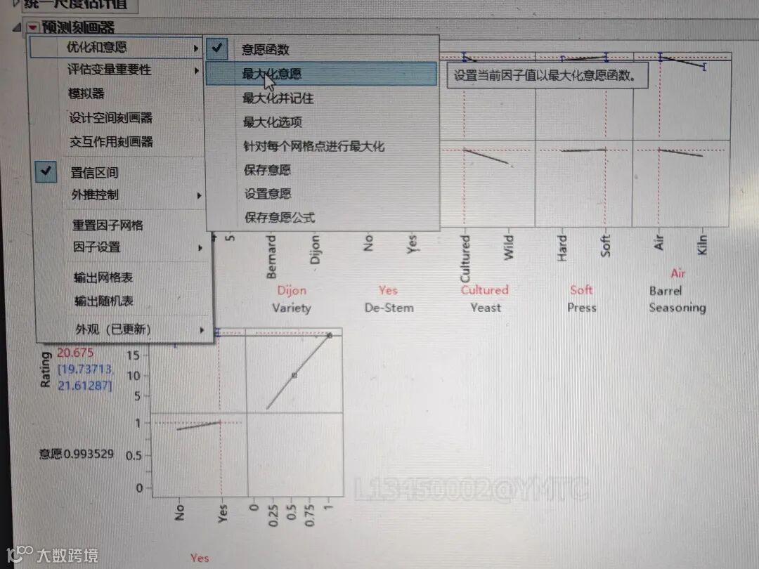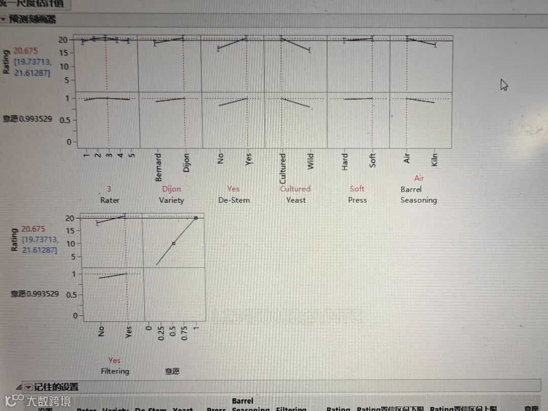 还可以在预测刻画器这里选择优化和意愿下拉菜单,选择最大化意愿(如图六所示),此时可以看到对应此模型下,对于响应的最优解为:Variety Dijon_De stem Yes_Yeast Cultured_Press Soft_Barrel Seasoning Air_Flitering Yes。