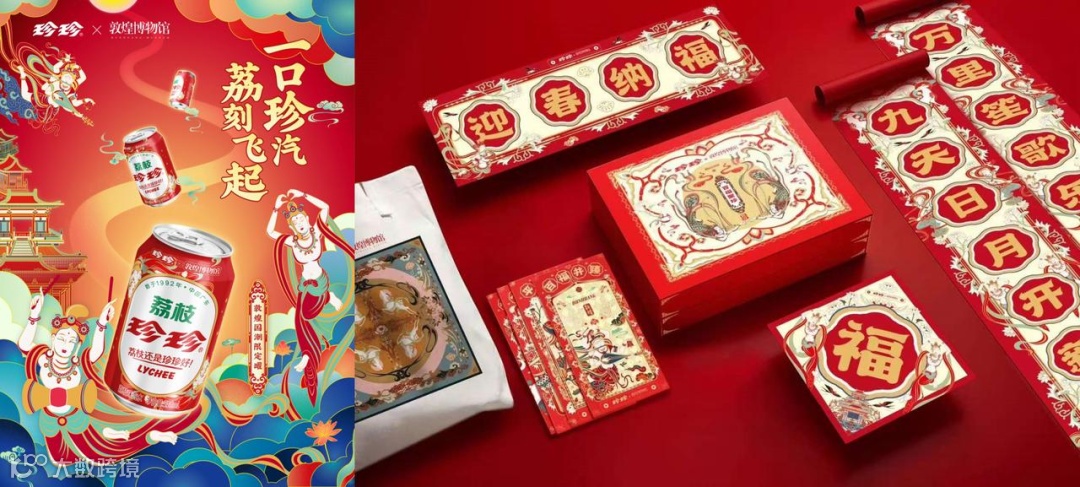 珍珍 × 敦煌博物馆:2022年新春推出虎年限定产品,融合飞天、祥瑞白虎等敦煌元素,此前还发布国潮酷爽系列,采用红绿、黑白撞色设计,彰显传统文化魅力与品牌高级感[k]。
