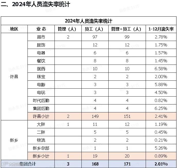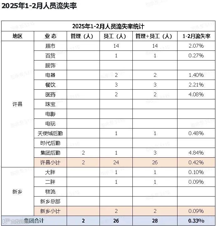 据胖东来官网数据,2025年1月至2月集团人员流失28人,流失率为0.33%。2024年全年流失171人,流失率2.01%。其中,许昌地区超市业务流失99人,流失率2.78%;医药业务流失率最高,达6.58%[k]