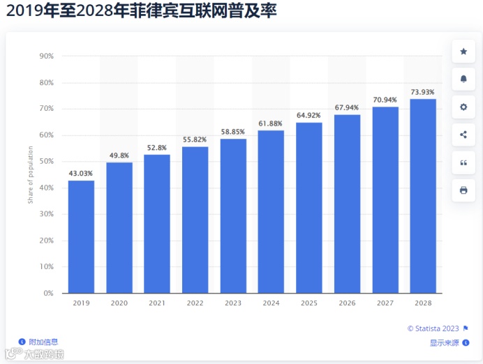 statista数据显示,2022年菲律宾互联网普及率为55.82%,预计在2028年菲律宾互联网普及率将达73.93%。互联网普及率的增加,菲律宾消费者开始转向网上购物,为菲律宾电子商务带来增长新机遇。