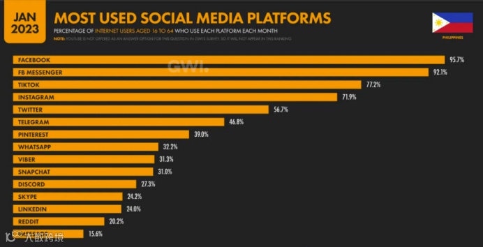根据meltwater数据显示,截至2023年1月,Facebook (95.7%)、FB Messenger (92.1%)、Tiktok (77.2%)、Instagram (71.9%)、Twitter (56.7%)是菲律宾用户常用的社媒平台。
