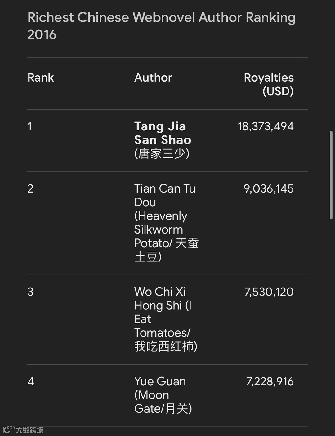 一些作者的作品尽管没在当月热门榜上,仍然有机会改编成有声书和网络漫画,带来额外收入。就我了解极少数人月收入能达到六位数(美元)。