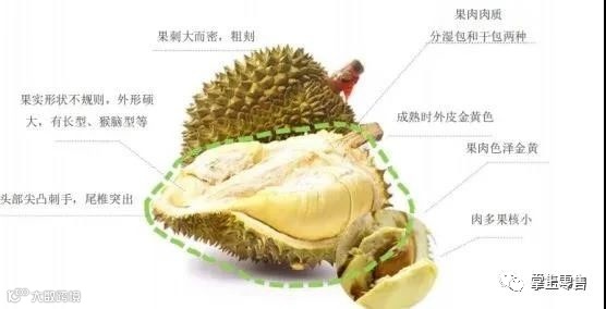 视觉判断:外皮由青转黄为成熟标志;刺粗大稀疏者果肉厚实细腻,刺细密者果肉较薄;成熟榴莲底部常有自然裂口[k]。