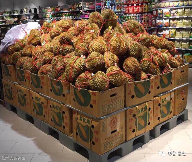 日销过万门店可参考整箱陈列模式,每颗榴莲应系绳便于顾客挑选[k]。