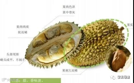 金枕榴莲:果皮青黄,刺小而密,果肉淡黄,清甜微脆,核小肉厚,是超市主力商品[k]。