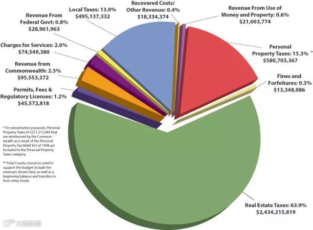 弗吉尼亚州费尔法克斯县2016年预算,房地产税占政府收入的63.9%