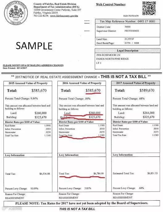 下图是弗吉尼亚州费尔法克斯县(Fairfax County)的房地产税示意表,表中显示了一户屋主2015年、2016年应缴房地产税的数目以及2017年估计应缴房地产税的数目。以2016年的房地产价值为例,共585670美元,其中地产为26万美元、房产为325670美元,房地产税的税率是1.1585%,所以应缴房地产税为6784.99美元。