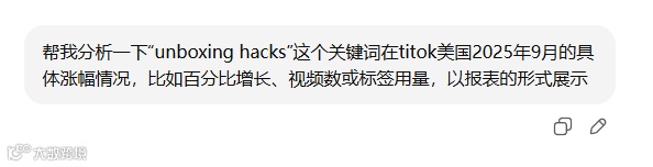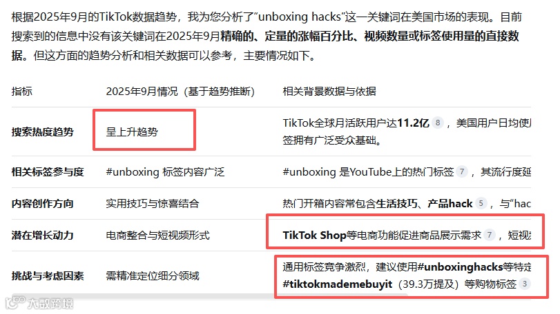 当时AI给他的报告显示,unboxing hacks(开箱技巧)的搜索量一周内涨了230%,但相关视频还不多。