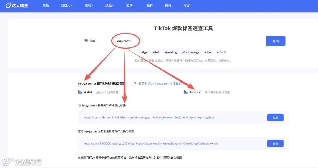 打开类似达人精灵、Tiktok analytics的工具,输入你的产品关键词(比如瑜伽裤),设置时间范围(建议选 7-30 天),AI 会自动生成趋势报告 —— 哪些关键词搜索量在飙升,哪些话题标签正在被大量使用,甚至能预测未来一周可能火起来的内容方向。
