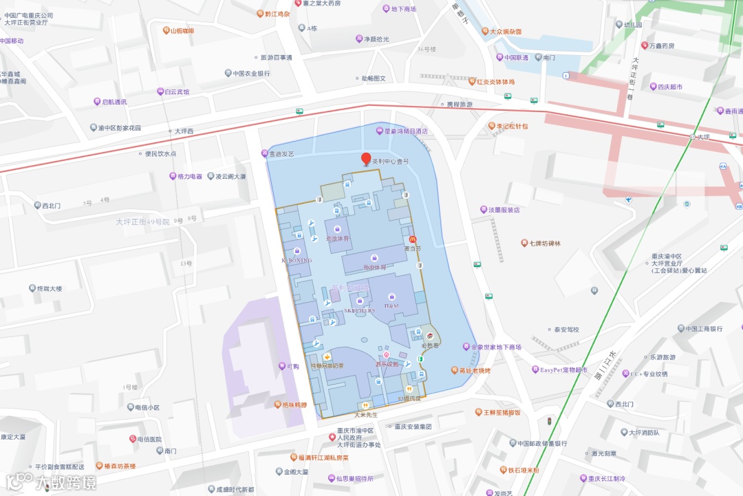 重庆大坪地铁站1号口步行约416米,可搭乘轨道交通1号线或2号线到达;公交462、871路至大坪站步行306米,或466、476、818路至大坪七牌坊步行159米可达。[k]