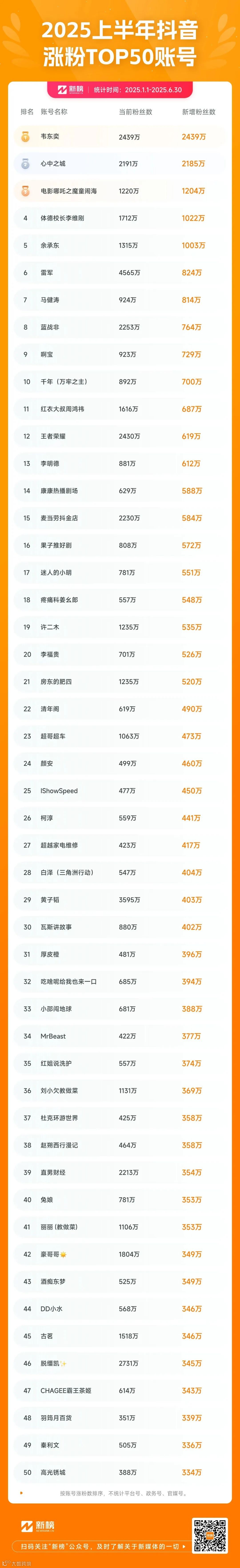 新榜发布·2025上半年抖音涨粉Top50榜单解析