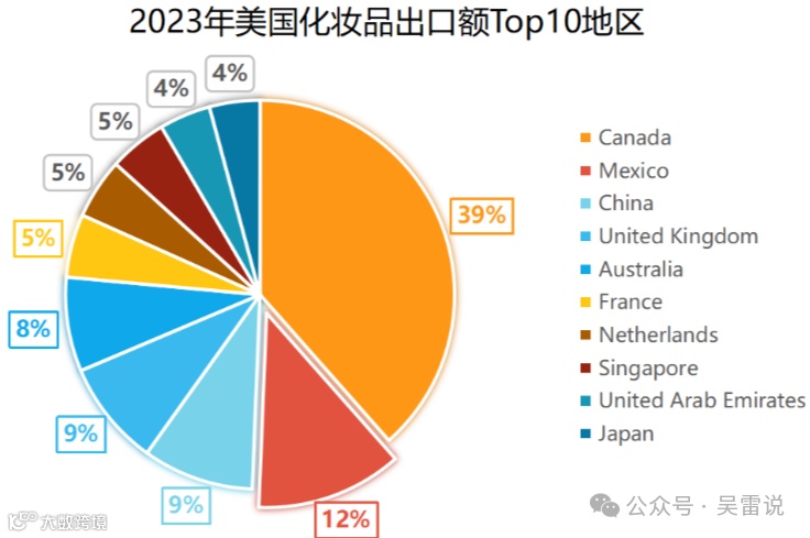 按国家来看,由于近似的文化交流圈以及北美自由贸易协定的框架,北美的加拿大和墨西哥一直以来都是美国化妆品的主要出口国,占据了美国该类出口份额的一半。中国是美国化妆品的第三大出口国,2023年美国对华化妆品出口额为8.96亿美元,较2022年同比下降8.85%,是自2019年起连续增长后的首次下跌。除此之外,欧洲的英国、法国、荷兰,亚洲的新加坡、日本以及澳大利亚、阿联酋都是美国化妆品主要的出口国。