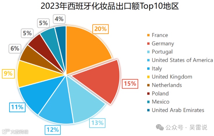 欧洲是西班牙化妆品的主要出口地区,其中法国是西班牙最大的出口国,占据了该类总出口份额的1/5,德国、葡萄牙、意大利、英国也是主要出口国。北美地区(美国和墨西哥)是西班牙化妆品出口的第二大地区。除此之外,阿联酋和中国也是西班牙化妆品主要出口国,2023年西班牙对华化妆品出口额为1.63亿美元,较2022年同比增长2.34%。