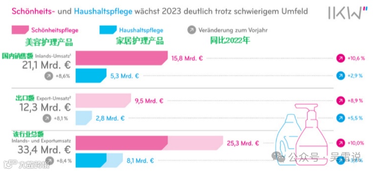 根据德国化妆品协会IKW统计,2023年德国美容护理和家庭护理销售额增长至334亿欧元,较2022年同比增长8.4%,香水、化妆品和洗涤剂是主要推动力。其中德国美容和家庭护理产品国内销售额增长8.6%至211亿欧元,出口销售额增长8.1%至123亿欧元。