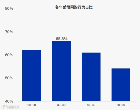 数据显示,30-39岁年龄段中,有65.8%的消费者会网购,是所有年龄段中网购比例最高的。10-19岁、40-49岁年龄段的消费者也有超过60%的消费者会网购。