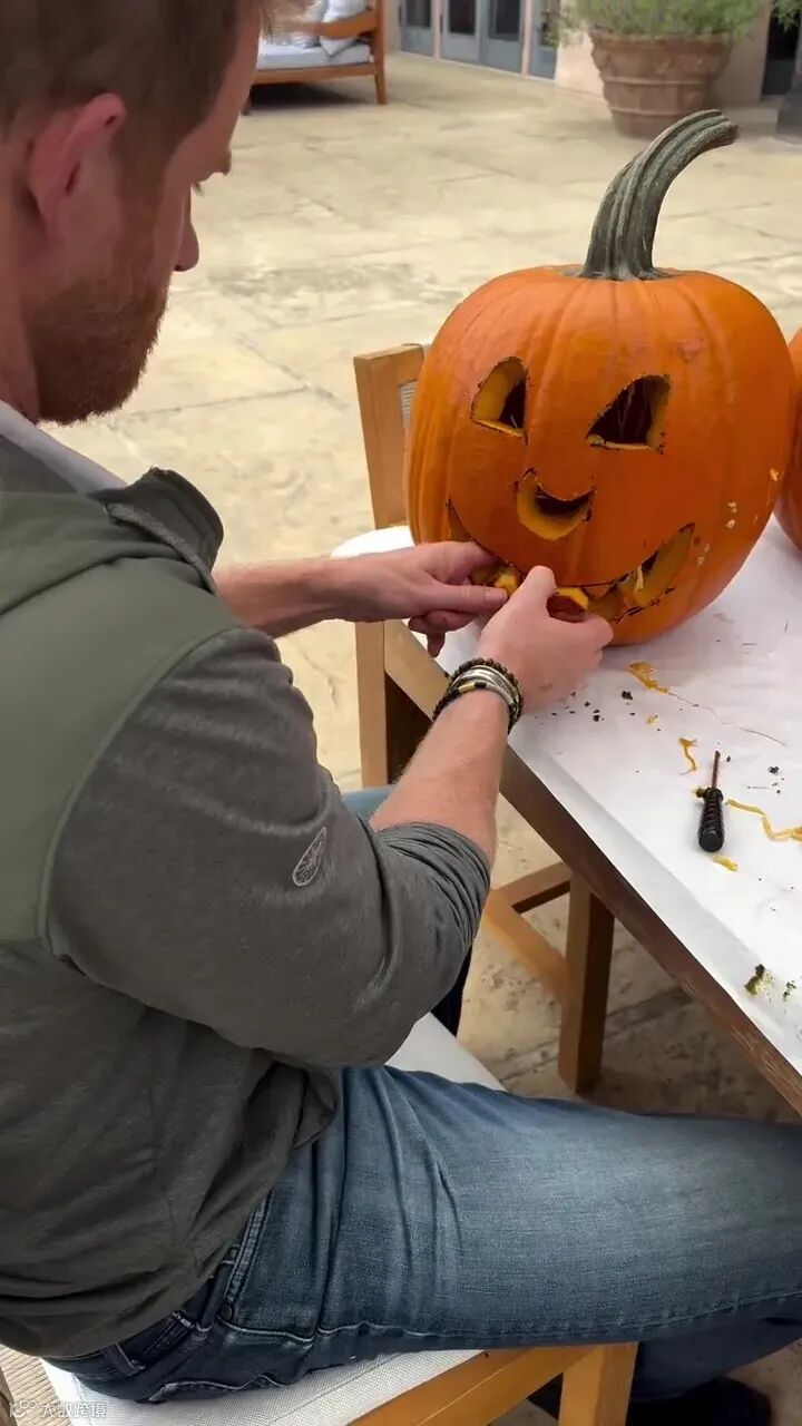 镜头一转,哈里专注地为孩子们雕刻一个巨大的南瓜灯,而梅根则在一旁拍摄、笑声不断。