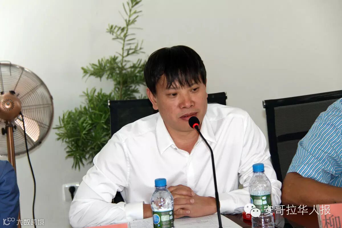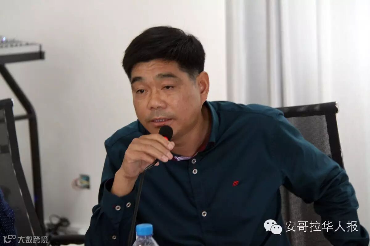 浙江商会秘书长温怀宇:非常感谢使馆领导和领事来参加会议,这个会议非常重要,也非常及时。现在安哥拉的经济状况不是很好,高速路两旁涌现出一批中国商贸城,可能是大家觉得目前也没有其他很好的投资项目。