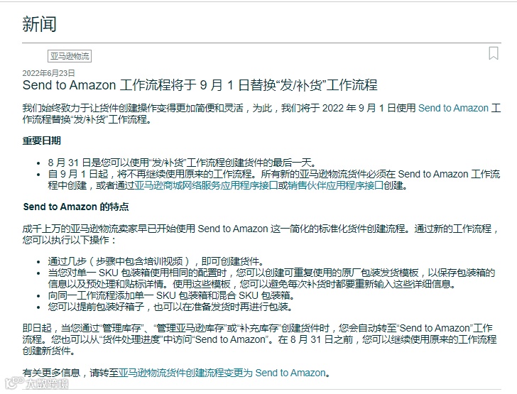 据悉,亚马逊在美国站、欧洲站和日本站发布公告称,于9月1日起正式停用现有的“发/补货”流程,启用全新的流程“Send to Amazon”。