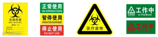 ● 专用标识:用于标注实验室安全等级、使用状态等,常见于主入口、医废处置区及设备上[k]。