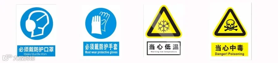 常用安全标识分为四大类:警告标识、禁止标识、指令标识、提示标识,此外还包括实验室专用标识,如病原微生物实验室生物安全标识等[k]。